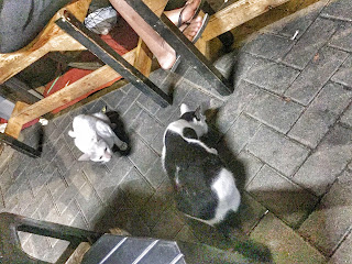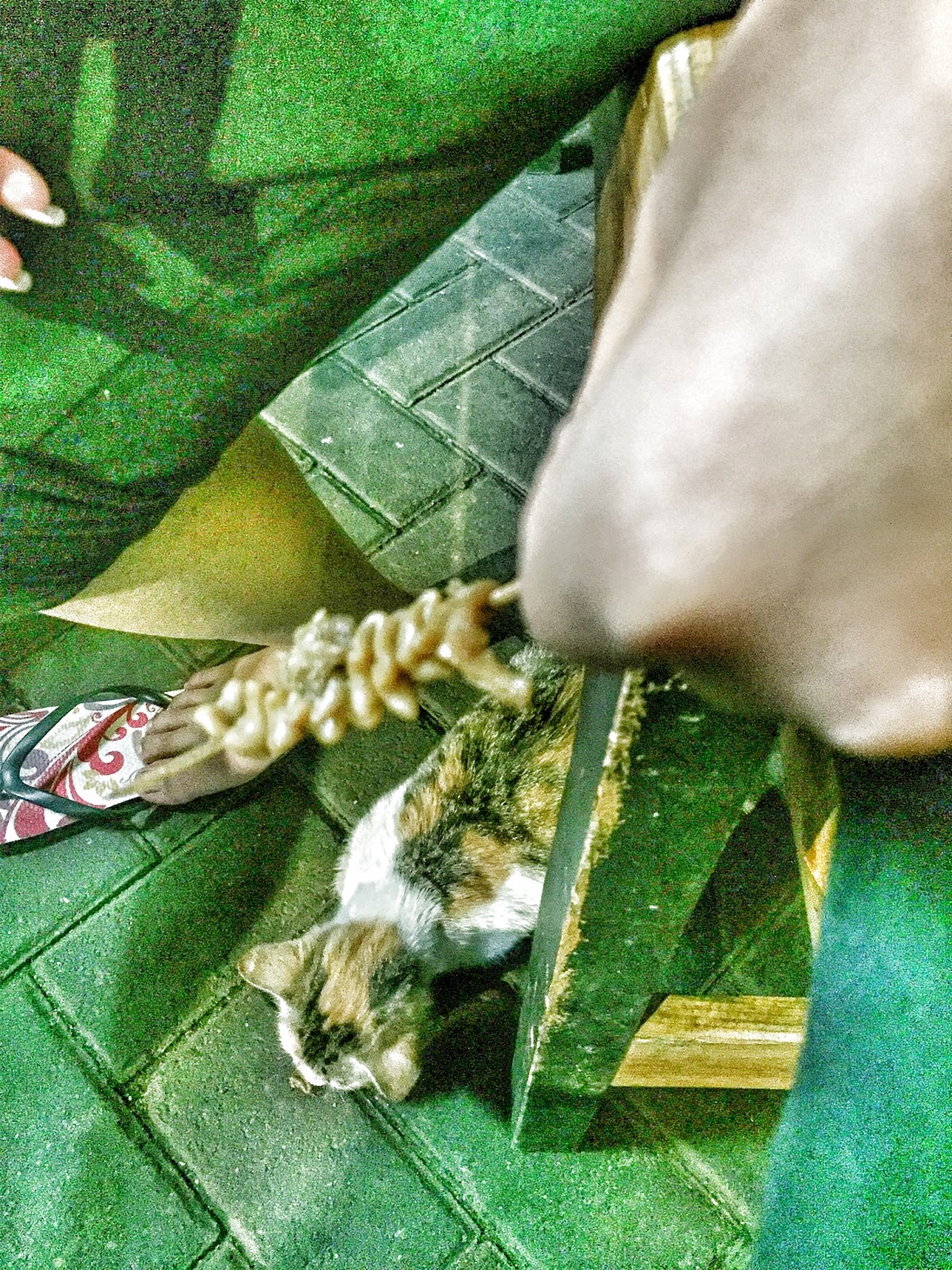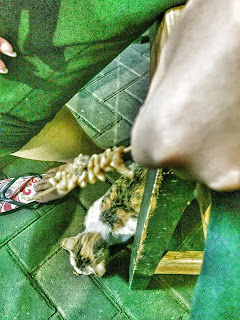 Entah kenapa, bila berkunjung ke sini selalu berakhir dengan celingak celinguk gak jelas. Ada beberapa kucing yang berkeliaran kesana kemari di sini, berharap mendapat sisa sisa makanan atau pemberian pengunjung yang datang. Aku gitu loh, gak bisa liat kucing kan, selalu gemes aja liatnya. When I look into the eyes of a cat, I see a living being, I see a friend, I feel a soul. I don’t see an animal. Kalau di tukang bubur ayam langganan, para kucing sukanya sate rempelo - hati ayam, sebelum pulang aku biasanya membeli beberapa tusuk dan menitipkannya kepada sang abang untuk diberikan ke kucing. Tapi kalau di sini, para kucing ini penggemar sate rempelo - hati ayam dan sate usus. Seringkali kubeli beberapa tusuk sate, lalu kuberikan diam - diam ke kucing kucing di bawah kakiku. Kenapa harus diam - diam? Dilema guys, sate - sate ini kan hidangan utama di angkringan sini, berasa gak enak hati aja ketika aku memberikannya ke kucing kucing sementara ada banyak pengunjung yang makan sate yang sama dengan nikmatnya, sementara yang punya angkringan pun menjualnya untuk para manusia bukan para kucing. (Hahaaa..)