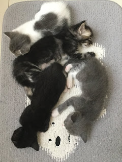 Tepat sebulan umur 4 krucil ini. Sejauh ini, Aku sudah mengalami 3 kali kelahiran kucing, 3 kali menyaksikan langsung kelahiran mereka dan membantu memotongkan tali pusar bayi bayi kucing itu. Kelahiran pertama 3 bayi kucing, kelahiran kedua 3 juga, dan kelahiran ketiga 4 bayi kucing.